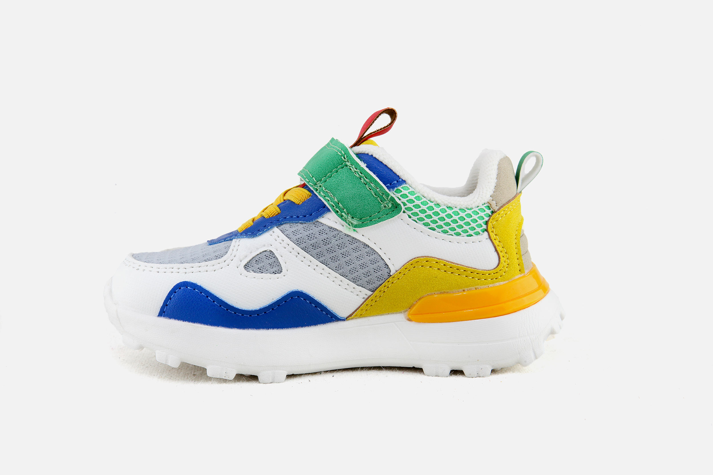 Cette basket pour enfants est présentée dans une version en textile gris, vert et bleu. Cette chaussure souple et légère se chausse et se déchausse facilement grâce à ses lacets élastiques et son scratch.