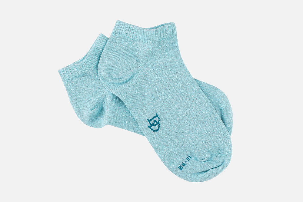 Chaussettes courtes pour enfant en maille jersey, tricotées à partir d'un coton à la fois fin et résistant. Les pointes sont remaillées maille à maille pour plus de confort au niveau des orteils. Talons et pointes renforcés. Ces chaussettes brillantes sont idéales portées avec des baskets. Fabriquées en Italie.